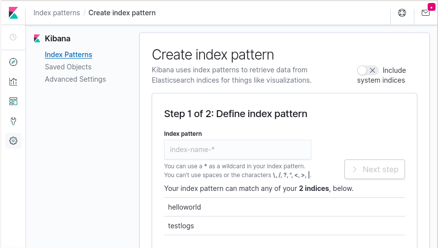 Both indices are there! We’ll create an index pattern from testlogs, and take a look at the actual data: