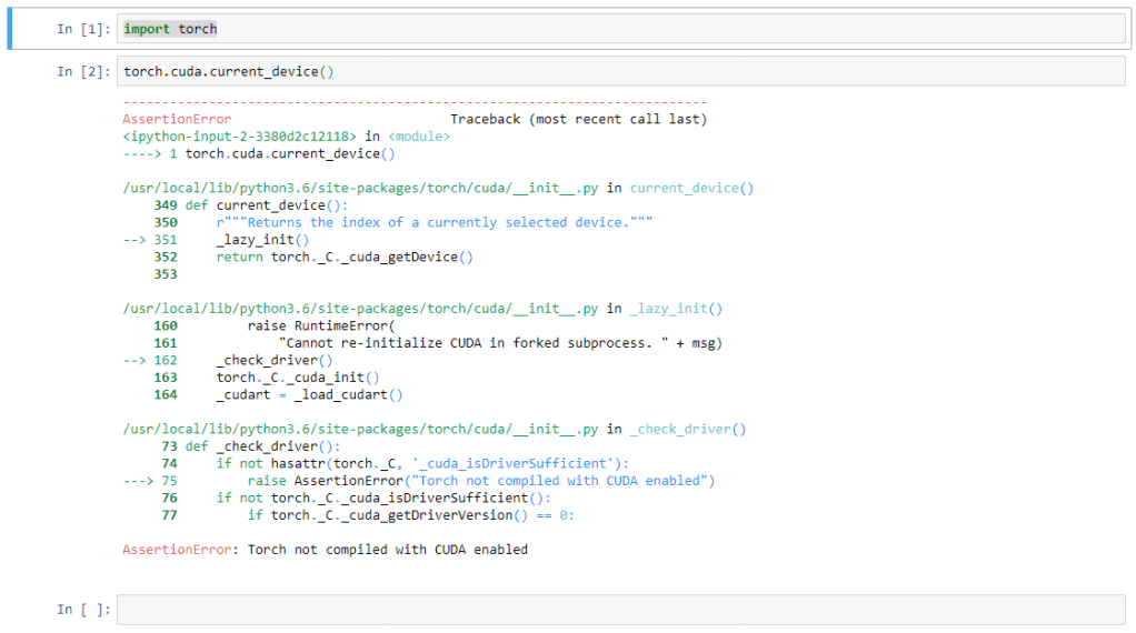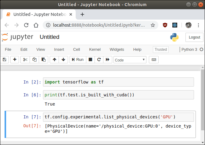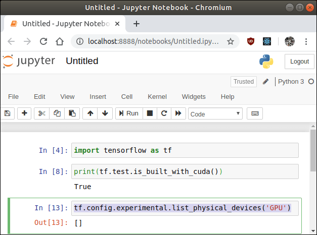 Logged in to the container and open New -> Python3, which opens the Python3 interpreter in Jupyter. First, I looked at whether the container was made for CUDA tools -> yes it was. Then I looked to see if the Jupyter notebook can recognize my graphics card, that reported an empty object []. So, its possibly not recognizing the graphics card.