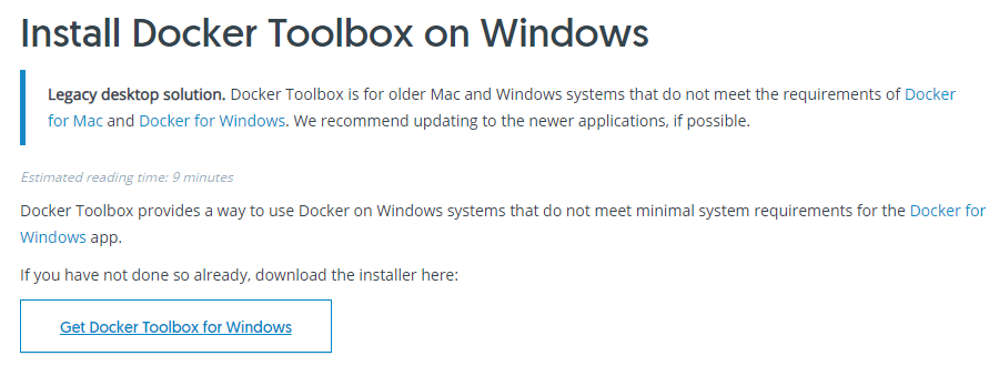 Then we download additional components into Docker to control containers in the Bash terminal on Windows. I downloaded DockerToolbox.exe from the page: https://docs.docker.com/v17.12/toolbox/toolbox_install_windows/
