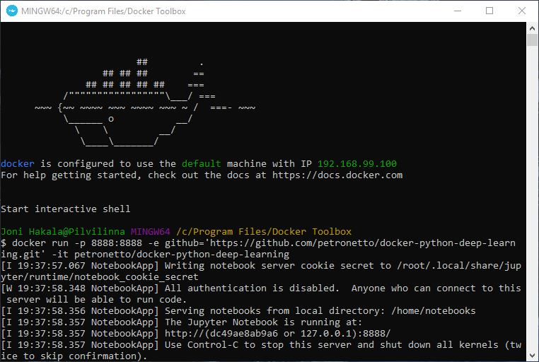 I wrote a command to the terminal “docker run -p 8888:8888 -e github=’https://github.com/petronetto/docker-python -deep-learning.git’ -it petronetto/docker-python-deep-learning“, which pulls directly from the Github page to create a container. The container is hosted in VirtuaBox, which came with DockerTools.