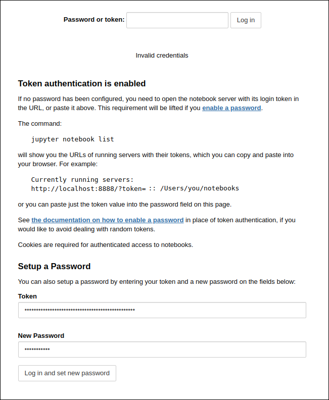 The container has a premade authentication method. You will need a “Token” value to log in to the container or to create a new password. The value of the token can be found as shown in the picture below.