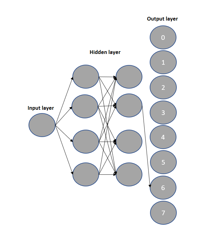 The model shown in the figure has an input value of 1, based on which the machine learning model calculates the most likely result and gives its output as 0-7. 1 input value of this model will be the informative message and 7 output values will be the log level for that message.